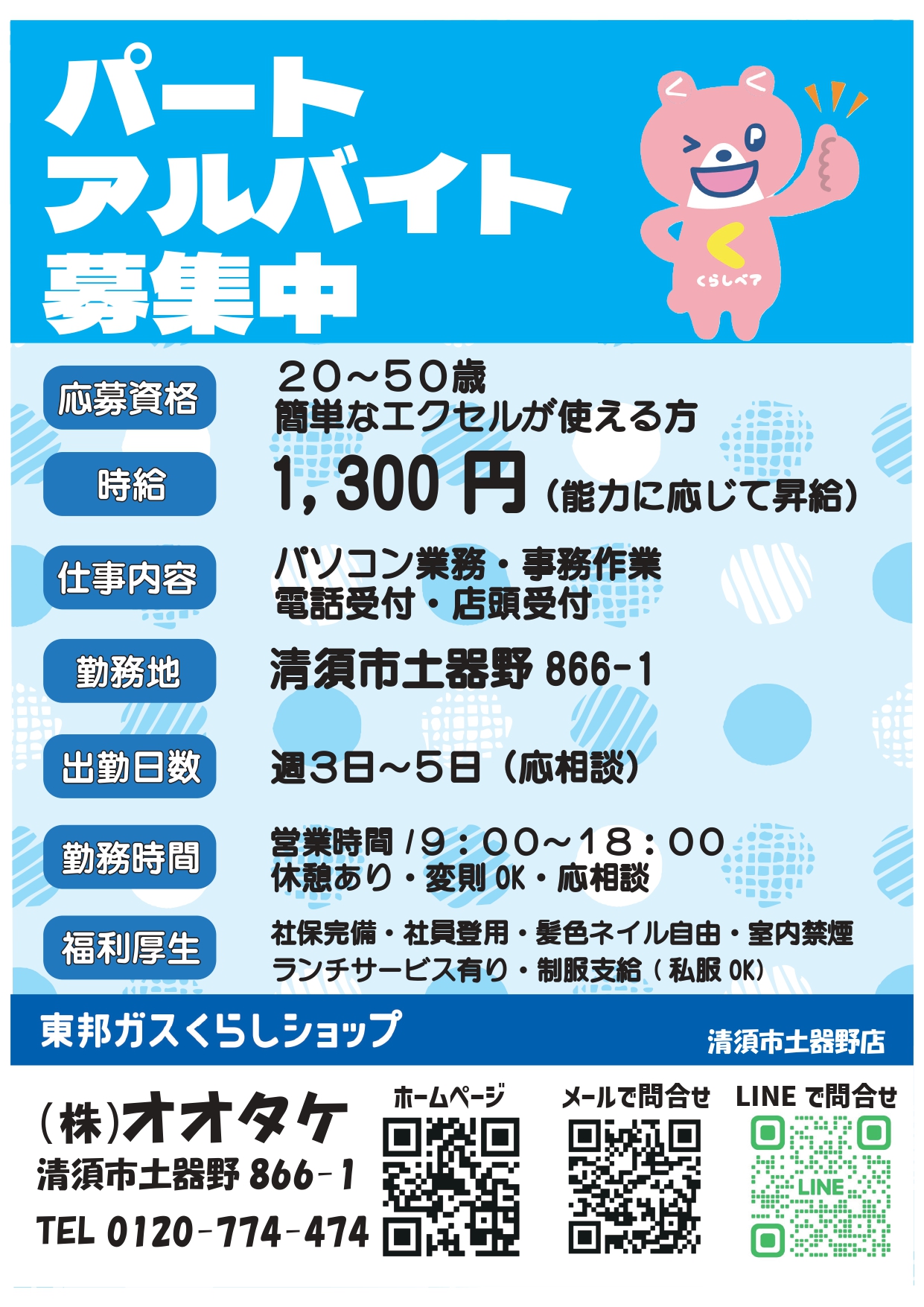 東邦ガスくらしショップ 清須市土器野店(株式会社オオタケ)では、事務・受付を担当していただけるパート・アルバイトスタッフを募集しています。